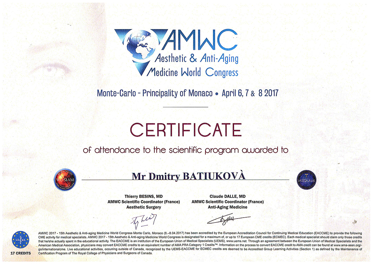 ДМИТРИЙ ВЛАДИМИРОВИЧ БАТЮКОВ – ведущий пластический хирург медицинского центра АНТЕС МЕД. Это специалист международного класса, имеющий огромный практический опыт: им проведено более 3400 пластических операций различной сложности. Подтверждением высокого профессионализма Дмитрия Батюкова может также служить огромное количество сертификатов и дипломов с международных форумов и конференций, а также ученая степень в медицине. Приходя в АНТЕС МЕД, Вы попадаете в надежные руки мастера.